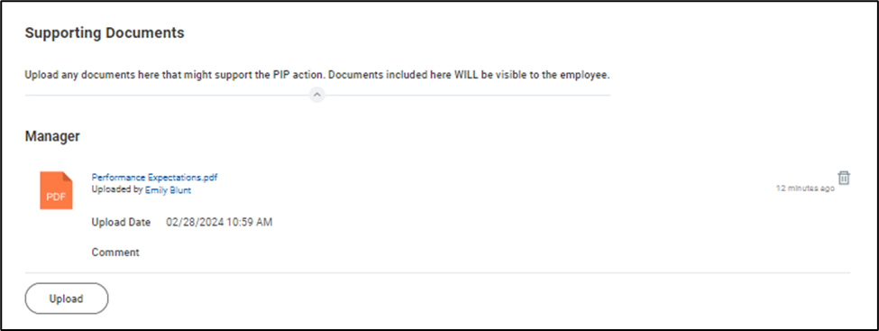 - You will be directed to the Supporting Documents page of the Performance Improvement Plan. Ensure documents are relevant and support the PIP action plan. Click Next to continue.