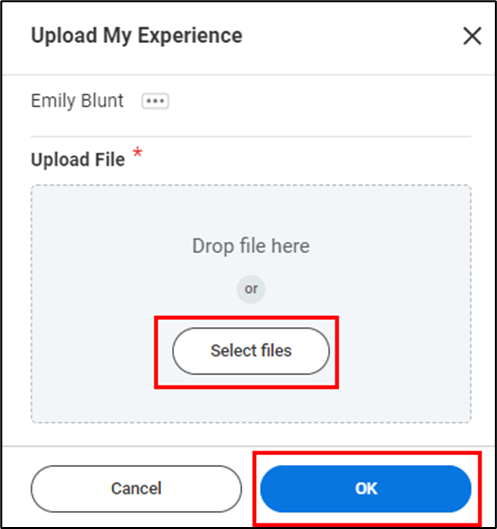 - If you chose the Automatic Entry method, click Select Files to upload your resume or CV from your computer. Once it has successfully uploaded, click OK.