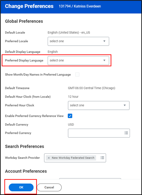 - If you selected Change Preferences, make language preference updates in your Global Preferences. Select the language in you would like in Preferred Display Language.