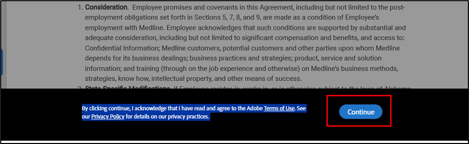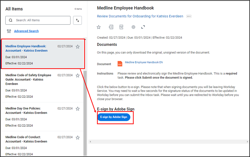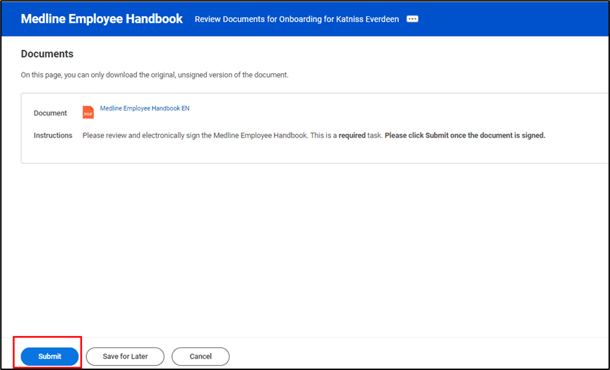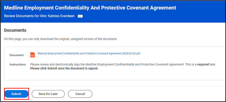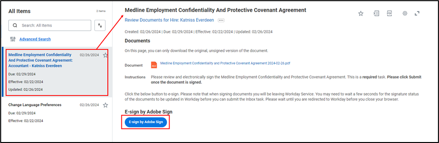 In addition, depending on your location or role, you may be required to sign additional documents. For example, for US salaried employees, you will be required to complete the Medline Employment Confidentiality and Protective Covenant Agreement. Please note, you may see a different task in your inbox depending on your role and location, you can utilize the same steps below to acknowledge the forms.