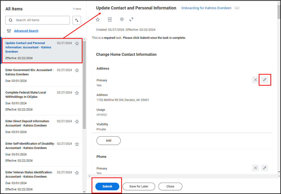 - To proceed with your onboarding tasks, you will be prompted to update your contact and personal information. Any information uploaded during the recruitment process will be automatically populated here. However, if you need to edit or add information, select the Update Contact and Personal Information task and select the Edit icon () to make edits to your personal information such as Address, Phone, Email, Legal Name, Preferred Name, Sex, Date of Birth, Marital Status, Race/Ethnicity. It is required to enter Home Address, Home Email and Home Phone. Optionally, you may also enter information such as your Citizenship Status, Sexual Orientation, Gender Identity and Pronouns. Click Submit once complete.