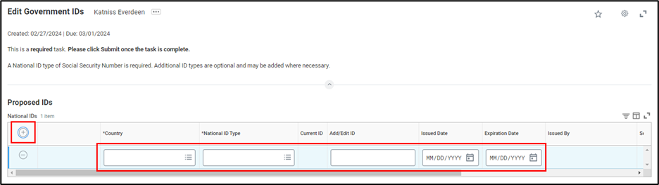 - To add a Social Security Number (SSN), click the Plus icon under National IDs. Next, add your information in the rows below.