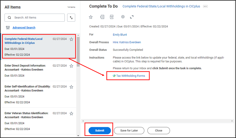 - Next, to enter your Federal/State/Local Tax Withholdings, click on the link Tax Withholding Forms to get to CICplus to fill out the forms. Click Submit once complete