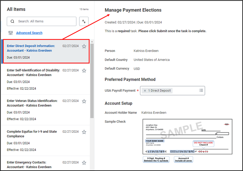 - Next, select the next task: Enter Direct Deposit Information to Manage Payment Elections. You will be required to submit your bank information for direct deposit purposes.