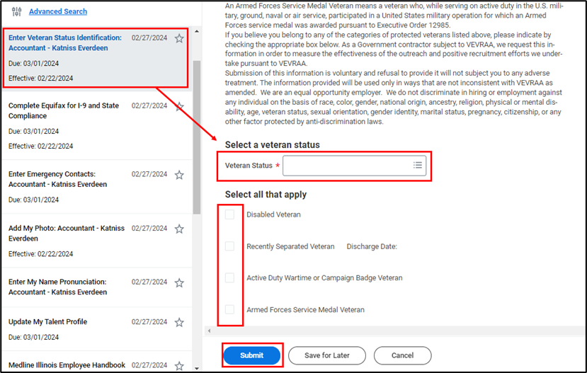 - Next, select the task and read through the information. At the bottom, Select a Veteran Status. If you belong to the following classifications of protected veterans, Select All that Apply in the next section below. Otherwise, do not select one and skip the question. Next, click Submit to proceed.