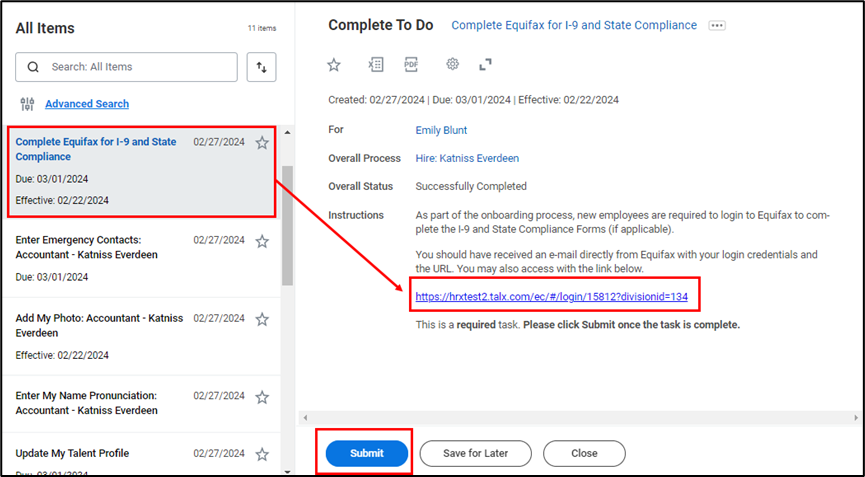 - Select the next task: Complete Equifax for I-9 and State Compliance. Click on the link to login to Equifax and complete the I-9 and State Compliances forms (if applicable). Select Submit to proceed.