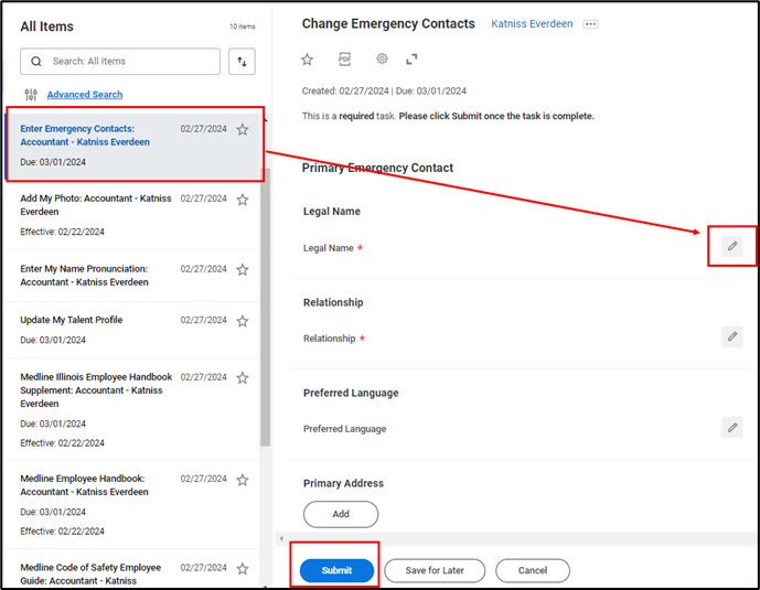 - Next, select the task Enter Emergency Contacts to enter your emergency contact information. Select the Pencil to add Legal Name, Relationship, Primary Email and Primary Phone and then click Submit. Please note that their Primary Phone will be required but Email is optional.