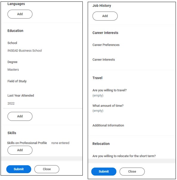 - If you have selected Go to Guided Editor or Go to Summary Editor, you will be prompted to enter your Languages, Education, Skills, Job History, Career Interests, Travel and Relocation information. Click Submit to complete this task.