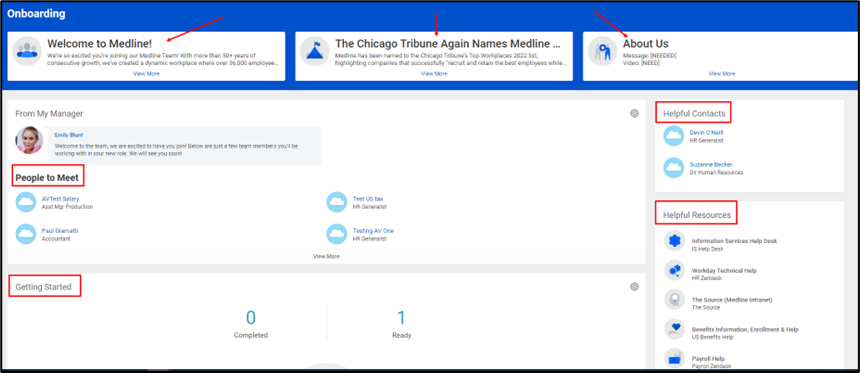 - From your Onboarding Dashboard, you can review a Welcome message, news and an About Us overview. You will also be able to see People to Meet, onboarding tasks assigned to you in Getting Started, links to Helpful Resources, Helpful Contacts, Medline Culture and assigned learning Required for You.