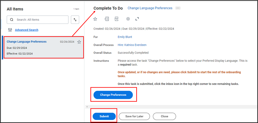 - Next, you will be brought to your Workday Task Inbox. You must indicate your language preferences before you can begin your onboarding tasks. Click on the task: Change Language Preferences. Select Change Preferences to make any edits. If you do not need to make edits, select Submit to proceed.