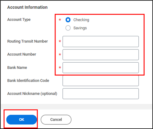 - Indicate your Account information. Select Account Type, indicate Routing Transit Number, Account Number and Bank Name. Once complete, click OK to proceed.