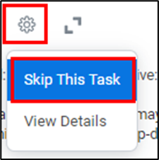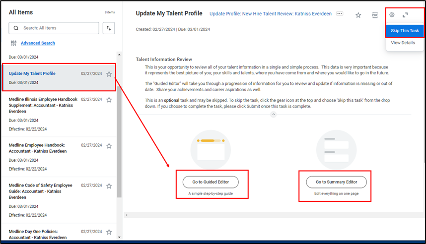 Next, on your start date, you will receive a task to update your Talent Profile. You may select Go to Guided Editor or Go to Summary Editor. This is an optional task and may be skipped, click on the Gear Icon and select Skip this Task if you do not want to complete this task.