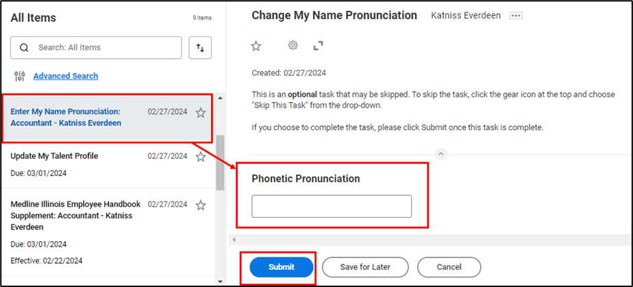 - Next, if you would like to change your name pronunciation, select the task Enter My Name Pronunciation. Type the Phonetic Pronunciation and click Submit. This is an optional task that may be skipped. Any information inputted here will show up in your Worker Profile.