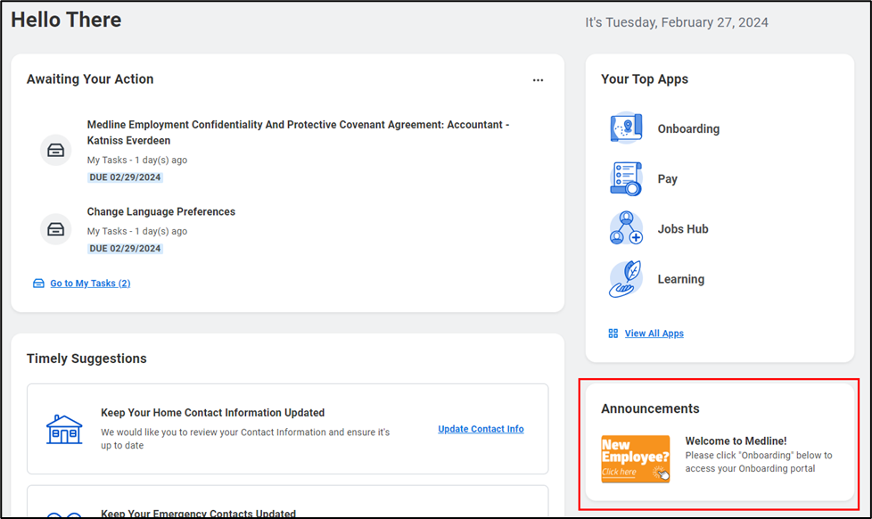 - As a new Medline employee, you will be able to complete your onboarding tasks through your Workday Onboarding Dashboard. From your Workday homepage, scroll down and select Welcome to Medline! in the Announcements section.