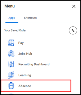 - From your Workday homepage, click the Menu icon in the top right-left corner of the screen. Select the Absence application.