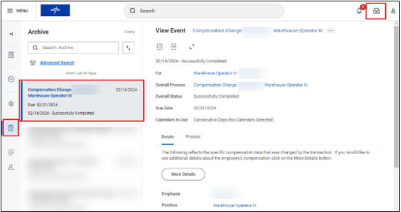 - During the approval process, you can navigate to the Compensation Change item in your Archive Inbox to track the progress of the compensation change request.