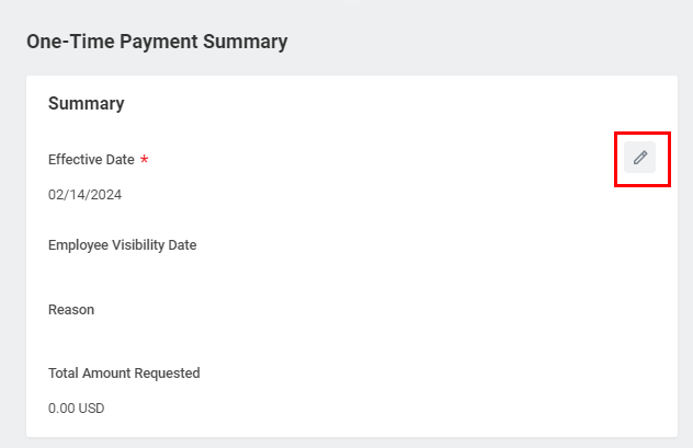 ) in the One-Time Payment Summary section and select a Reason. You can also set an Employee Visibility Date. This is when the employee can see the One-Time Payment. If you leave it blank, it will default to the Effective Date. Click the Checkmark icon (