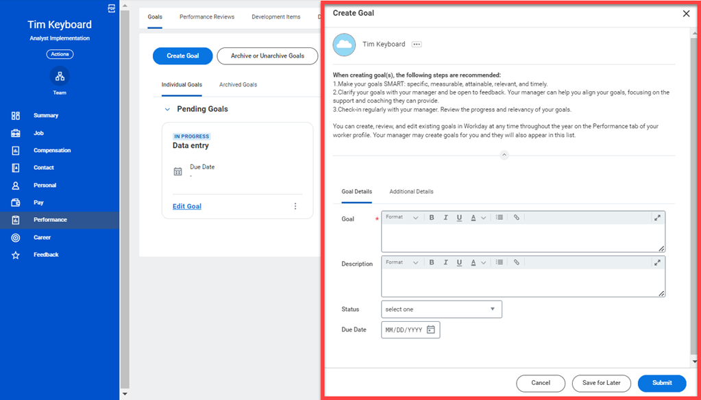 - On your profile page, navigate to the Performance section on the left and select Goals to Create, Edit, or View your performance goals. Completed goals will appear under the Archived Goals section.