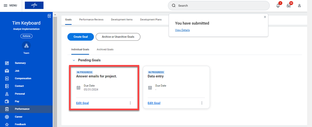 - On your profile page, navigate to the Performance section on the left and select Goals to Create, Edit, or View your performance goals. Completed goals will appear under the Archived Goals section.