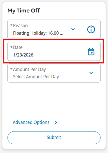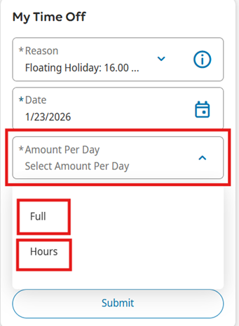 4. Select Amount Per Day and in the dropdown options, select Full for a full day off or Hours for a partial day off.