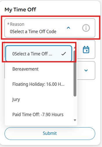 - From the My Time Off tile, select Reason for the type of time off.