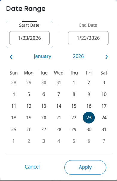 3. In the calendar Date Range, input your desired start and end dates. Click Apply.