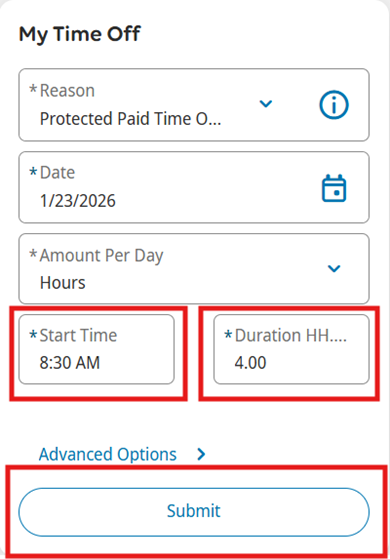 5. If selecting Hours. Input the Start Time and the Duration (formatted as HH.MM), which is the number of hours requested. Review and click Submit.