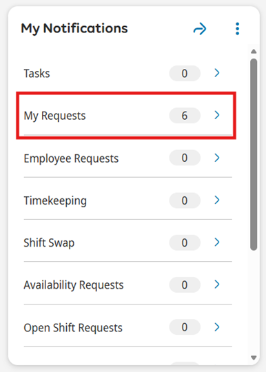 6. The request will then be submitted to your manager, who should review and approve/deny within 72 hours. If you have UKG Mobile, you will receive notification once your manager has approved/denied. If you submit multiple requests without enough available balance, some may be rejected. To review the status from UKG. Go to My Notifications tile from the home screen and click on My Requests.