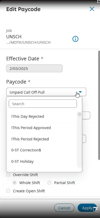 - Select the appropriate Pay Code from the drop-down and then click “Apply"