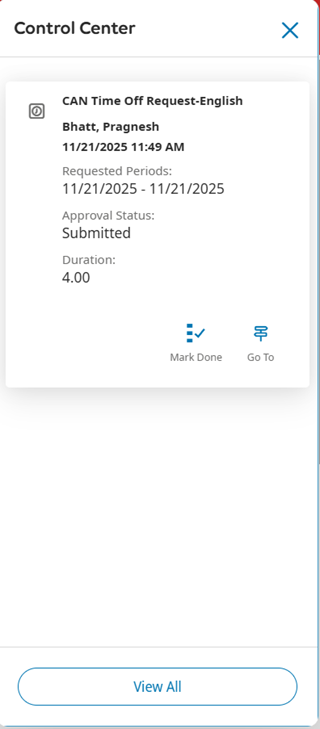 2. In the Control Center panel, click on the approved time-off request you want to cancel. It will display on the Control Center page.