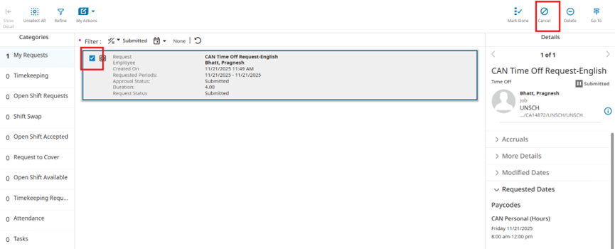 3. Select the request you want to cancel. Then click Cancel on the navigation bar.