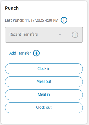 Log in to UKG using your SSO. On the home page, there will be a tile completely dedicated to punching in and out. Simply select Clock In, Meal Out, Meal In, and Clock Out at the appropriate time of day