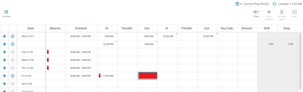 If you think you might have missed a punch you can check your timesheet to be sure that you always have an even number of punches. For example, you should have 1 Clock In and 1 Clock Out for a total of 2 punches, but you should not have only a Clock In or Only a Clock Out.