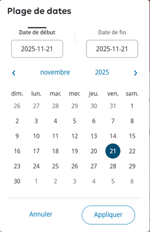 3. Dans la plage de dates du calendrier, entrez vos dates de début et de fin souhaitées. Cliquez sur Appliquer.