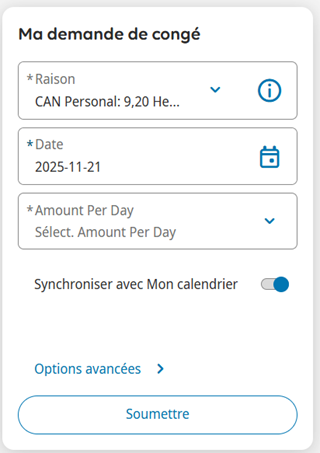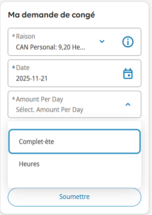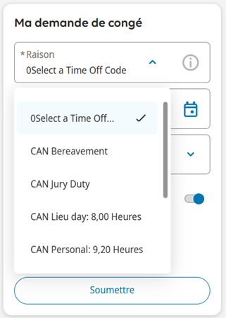 1. Dans la tuille Ma demande de conge, sélectionnez Raison pour le type de congé.
