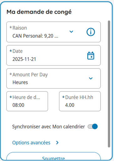 5. Entrez l' heure de début et la durée (formatée HH. MM), c'est-à-dire le nombre d'heures demandées. Examinez et cliquez sur Soumettre.
