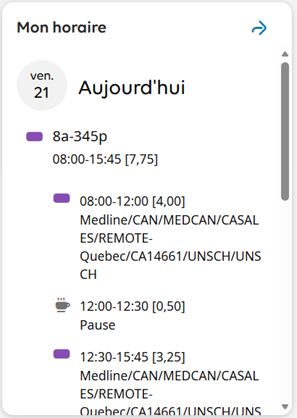 1. Dans la tuile Mon horaire, utilisez la barre de défilement pour consulter vos quarts de travail ou codes de paie prévus ainsi que les quarts de travail ouverts pour aujourd'hui et les six prochains jours.