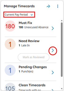 1. In the Manage Timecards tile, select Current Pay Period. Next to Need Review, select the View Need Review in Timecards arrow.
