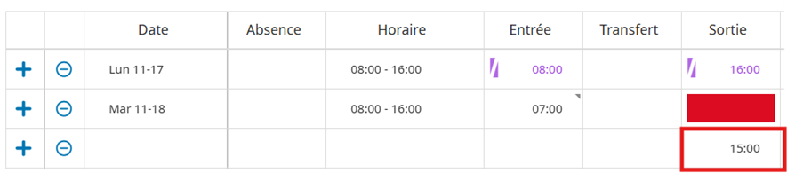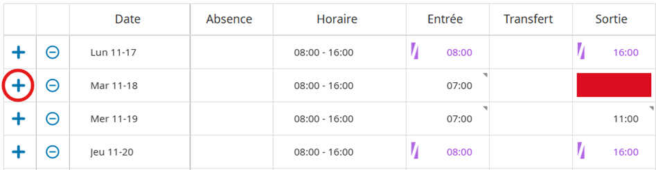 2. Sélectionnez le signe plus à côté de la cellule Date pour laquelle vous souhaitez ajouter un punch. Une nouvelle ligne est ajoutée à la feuille de temps.