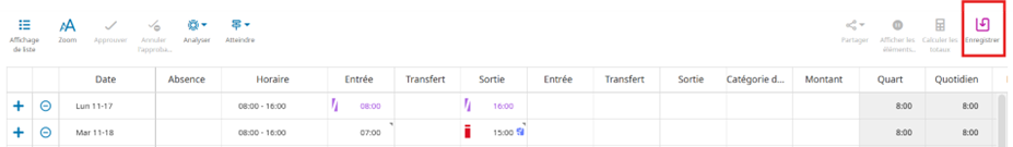 3. Sélectionnez la cellule Entrée dans la nouvelle rangée pour entrer une heure de début pour le quart ou la pause de l'employé, ou sélectionnez la cellule Sortie dans la nouvelle rangée pour entrer une heure de fin pour le quart ou la pause.