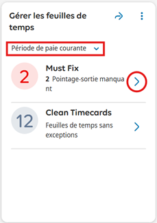 1. Dans la tuile Gérer les feuilles de temps, sélectionnez Période de paie courante. À côté de Must Fix, sélectionnez la flèche Voir Must Fix dans Timecards.
