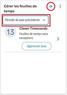 1. Dans la tuile Gérer les feuilles de temps, sélectionnez Période de paie précédente. Ensuite, sélectionnez la flèche All Timecards.