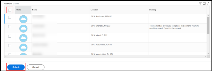- Next, select which employee(s) you would like to assign the course to using the checkbox beside their name. You can also select all by checking on the first checkbox in the header of the table. Once you’re finished, click Submit to proceed.