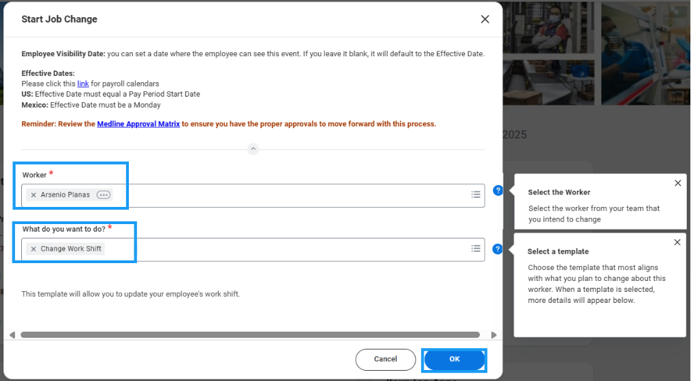 - Select the employee, choose the Change Work Shift template and click Ok.