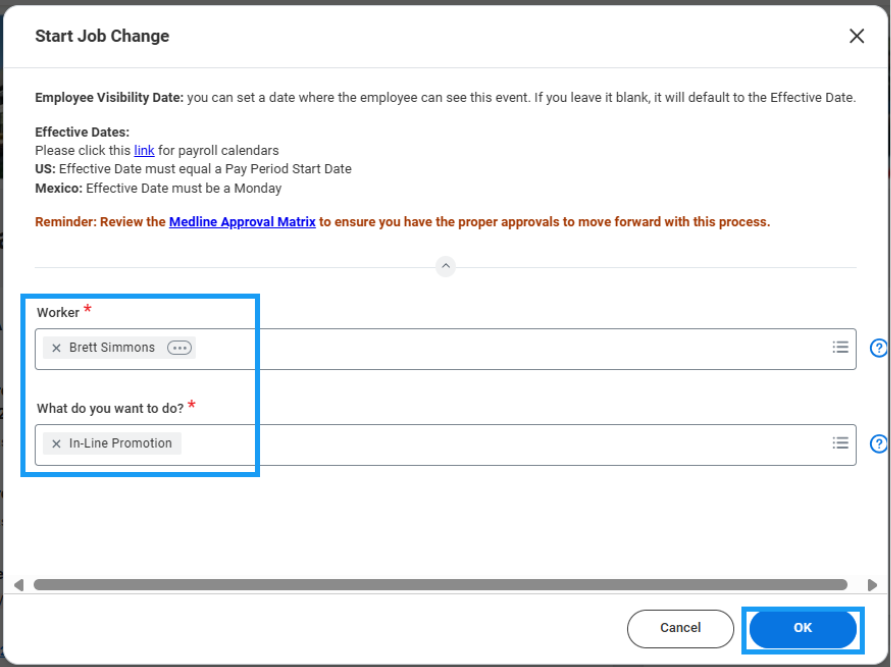 - Select the worker, choose the template called In Line Promotion, and click Ok.