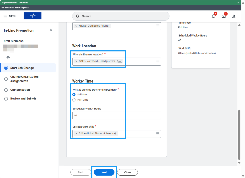 - Edit Job Profile, Work Location, Time Type, Scheduled Weekly Hours and/or Work Shift if necessary. Click Next.