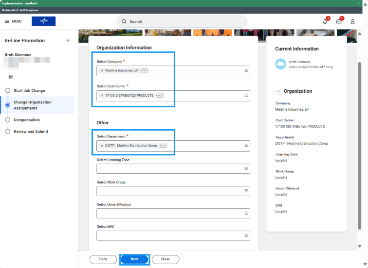 - Edit Company, Cost Center, Department, and other organizations if necessary. Click Next.