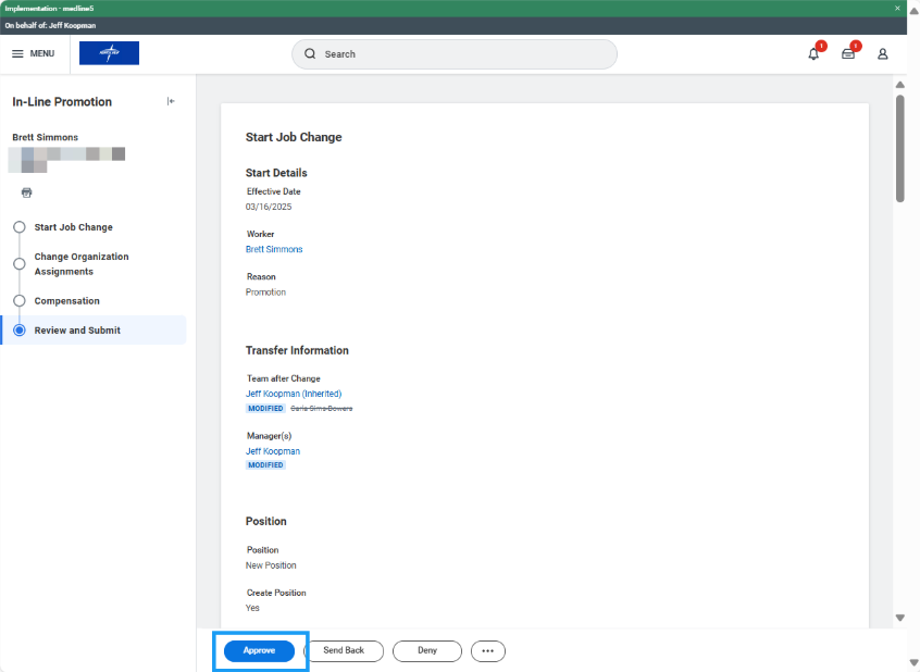 - Review accuracy of the change and click Approve to route for further approval if necessary. Approval flow is HR Partner > Manager’s Manager > 1st VP. Sometimes Compensation will be included in the approvals if certain criteria is met.