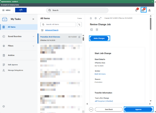 - Access the Promotion task in your My Tasks inbox and review the proposed changes. If edits are needed, click the blue “Make Changes” button at the top of the task to enter edit mode.